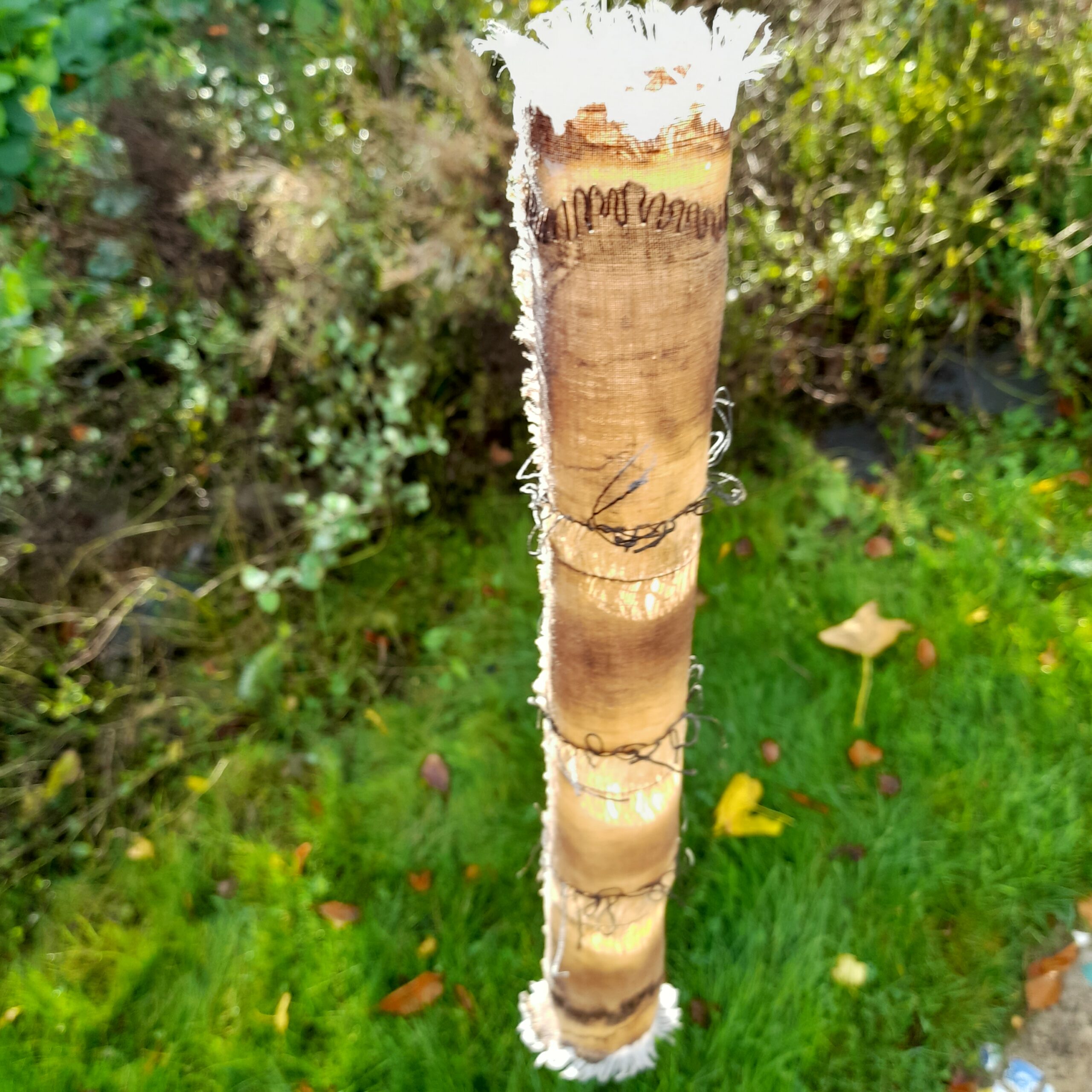 ‘Horsetail Reed’ is a hollow sculpture created from waxed linen painted with coffee and walnut ink. Pulled threads mimick the rippled segments in the Giant Horsetail reeds that dominate Pool Meadow. Found fishing wire sewn around the segments represents the random hairy strands typical of Horsetail. The hollow structure allows water to travel up the Horsetail walls for water retention.’