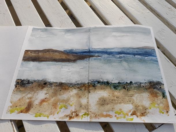 Capturing the essence of a place using paints made from the local plants and soils makes the task almost effortless – I am merely a conduit, the user of the brush. The painting nearly paints itself. These are some of the colour swatches and sketchbook pages I painted on this trip – sitting on a beach or rock, inspired by the turquiose blue sea, big blue skies, warmth of the breeze and earthy tones around me.’